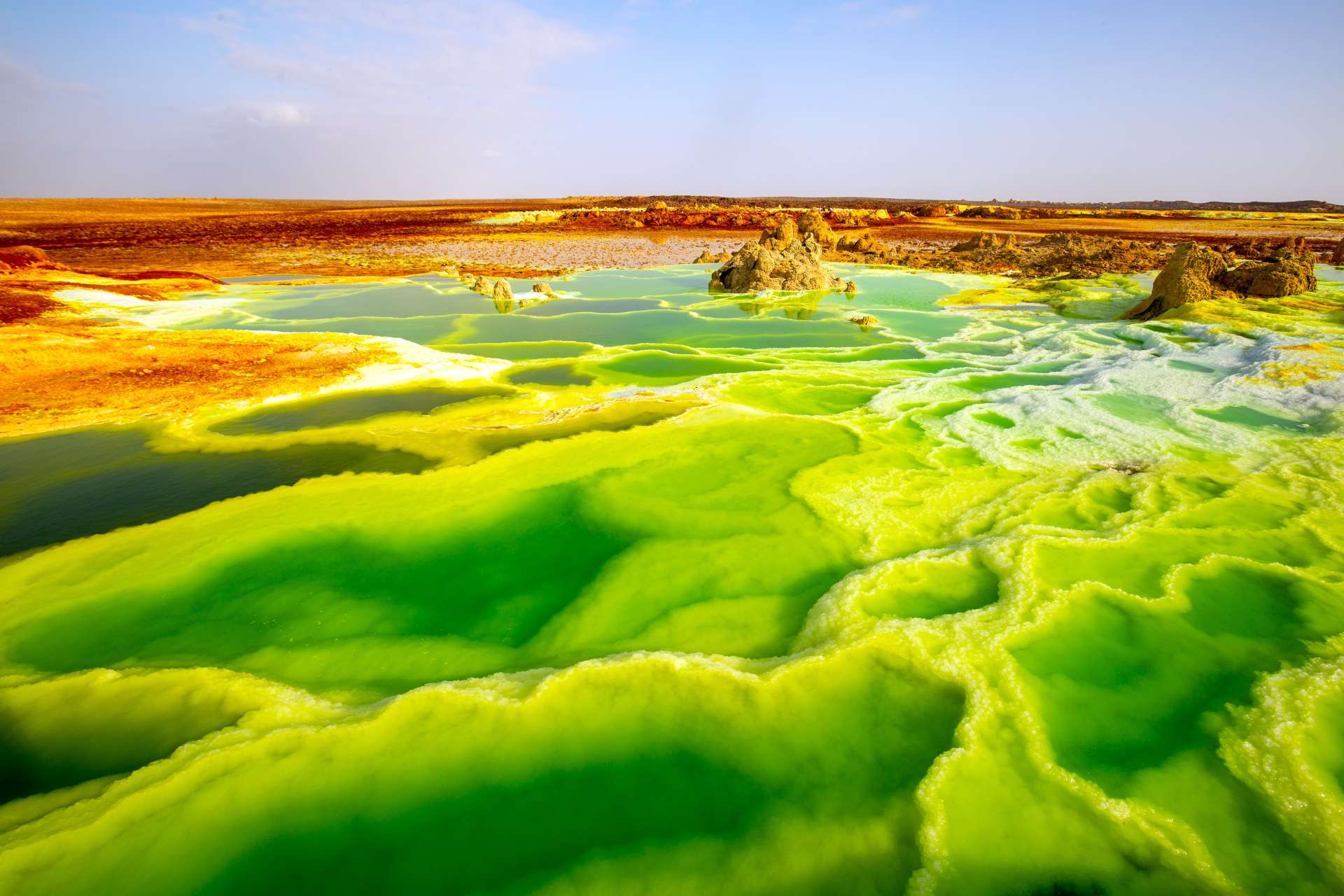 エチオピア・ダロール地区に位置する砂漠。塩分や硫黄、カリウムなどを含む温泉が結晶化した奇岩群が形成されており、黄色や緑など鮮やかな絶景が広がっています。