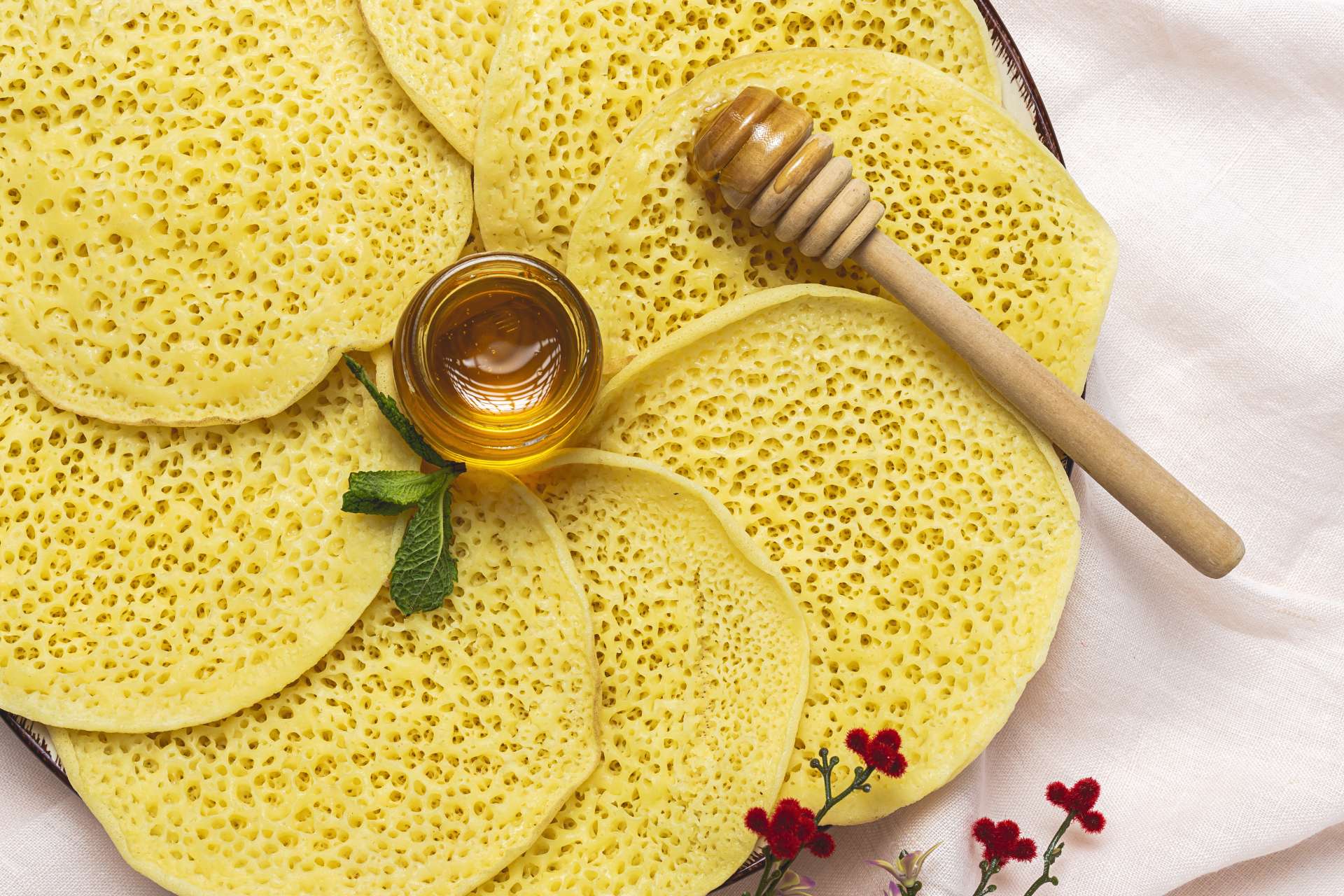 モロッコのパンケーキ。表面に小さな穴がたくさん空いているのが特徴で、生地はセモリナ粉(デュラム小麦を粗挽きした粉)で使用して作られます。バターやはちみつをたっぷりと染み込ませていただきます。