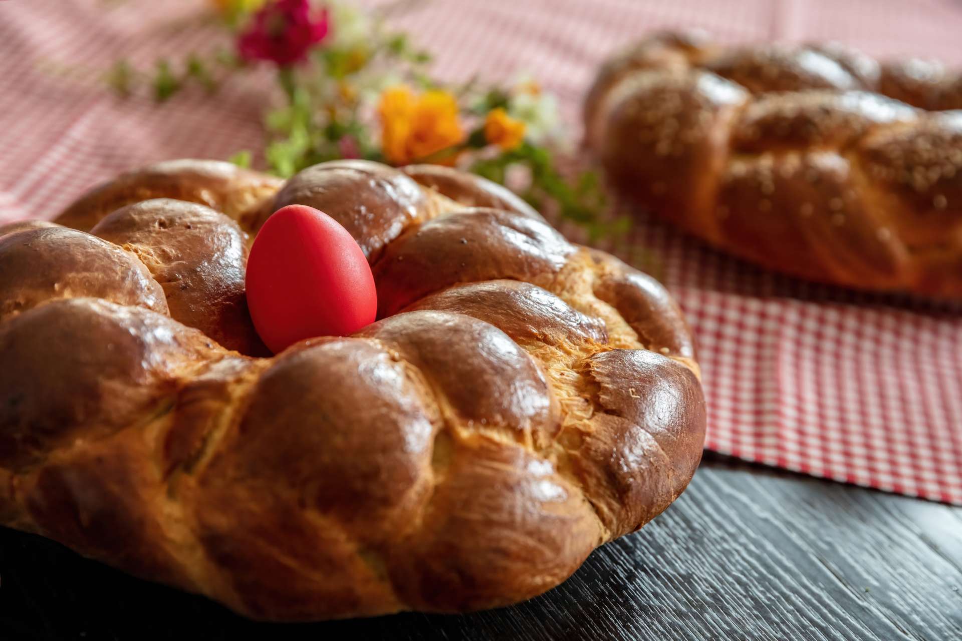ギリシャのイースターブレッド。小麦粉や牛乳、卵、砂糖、オレンジの皮などから作られ、編み込みが施された生地には赤く染色された卵が埋め込まれている (または生地の上にのせる) のが一般的です。