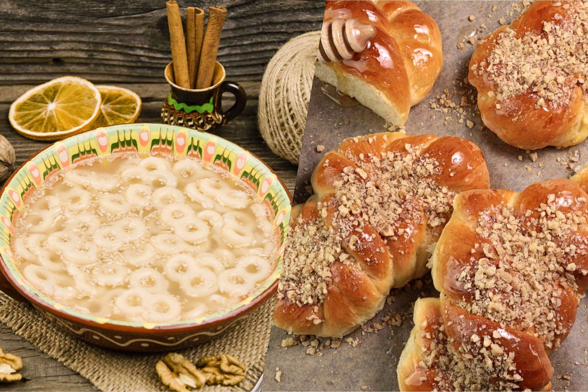 「スフィンツィショリ (Sfințișori)」という名称でも知られ、パン生地にはちみつや砕いたクルミをトッピングしたもの、または小さな8の形パスタやシナモン、クルミなどが入った甘いスープが供されます。