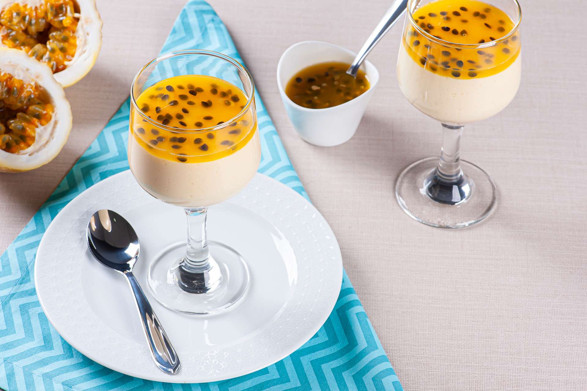 パッションフルーツのムース。コンデンスミルクや生クリーム、パッションフルーツの果汁などにゼラチンを加え、冷やし固めて作られます。ムースの上からパッションフルーツの果肉をかけて仕上げられるのが一般的です。