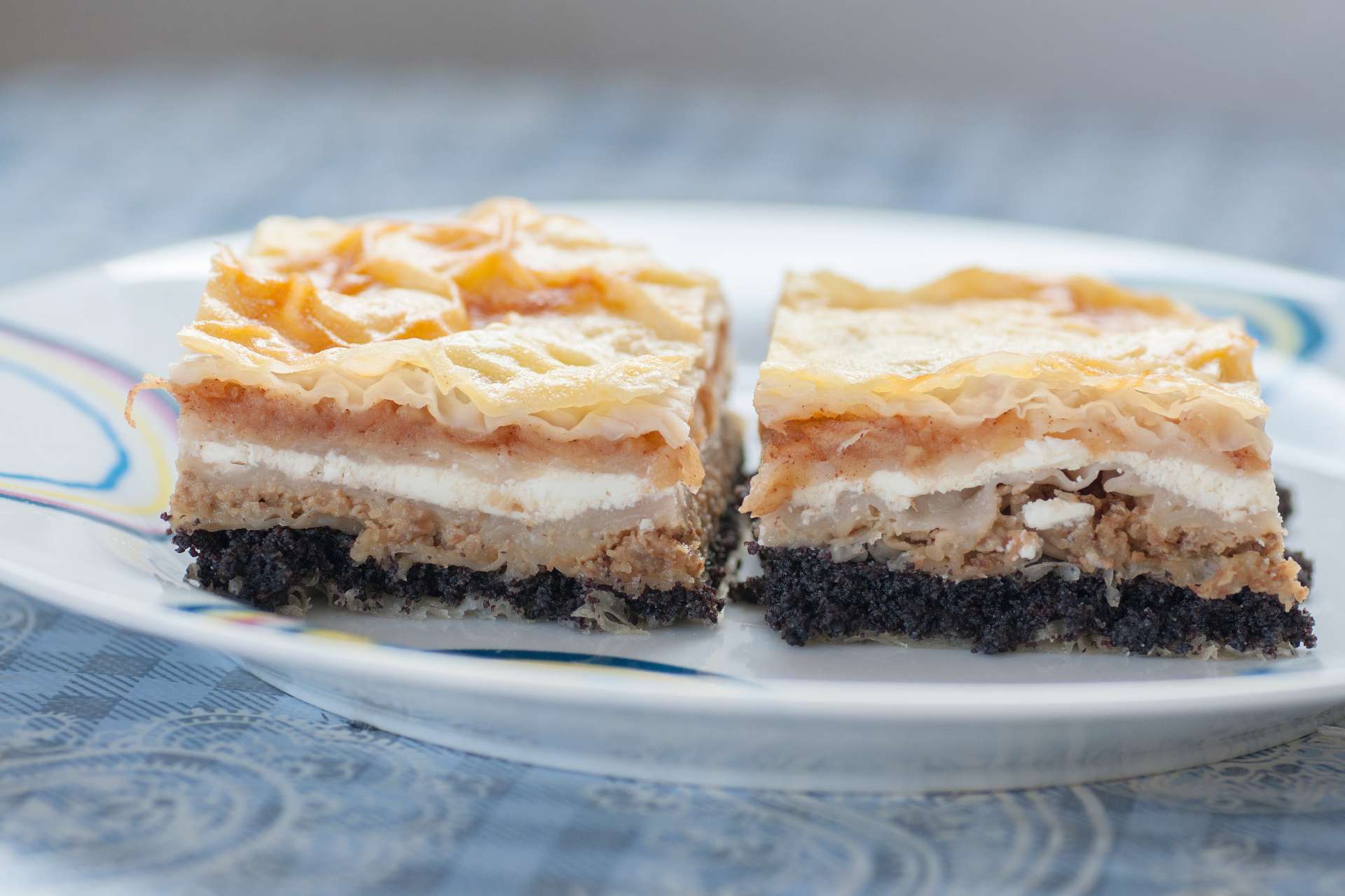 クロアチア・メジムリェ郡のケーキ。薄いフィロ生地にクルミやチーズ、ケシの実、すりおろしたりんごの4種類のフィリングが詰められています。メジムリェ郡に隣接するスロベニア・プレクムリエ地方にこのケーキによく似た「プレクムルスカ・ギバニツァ (Prekmurska Gibanica)」があります。