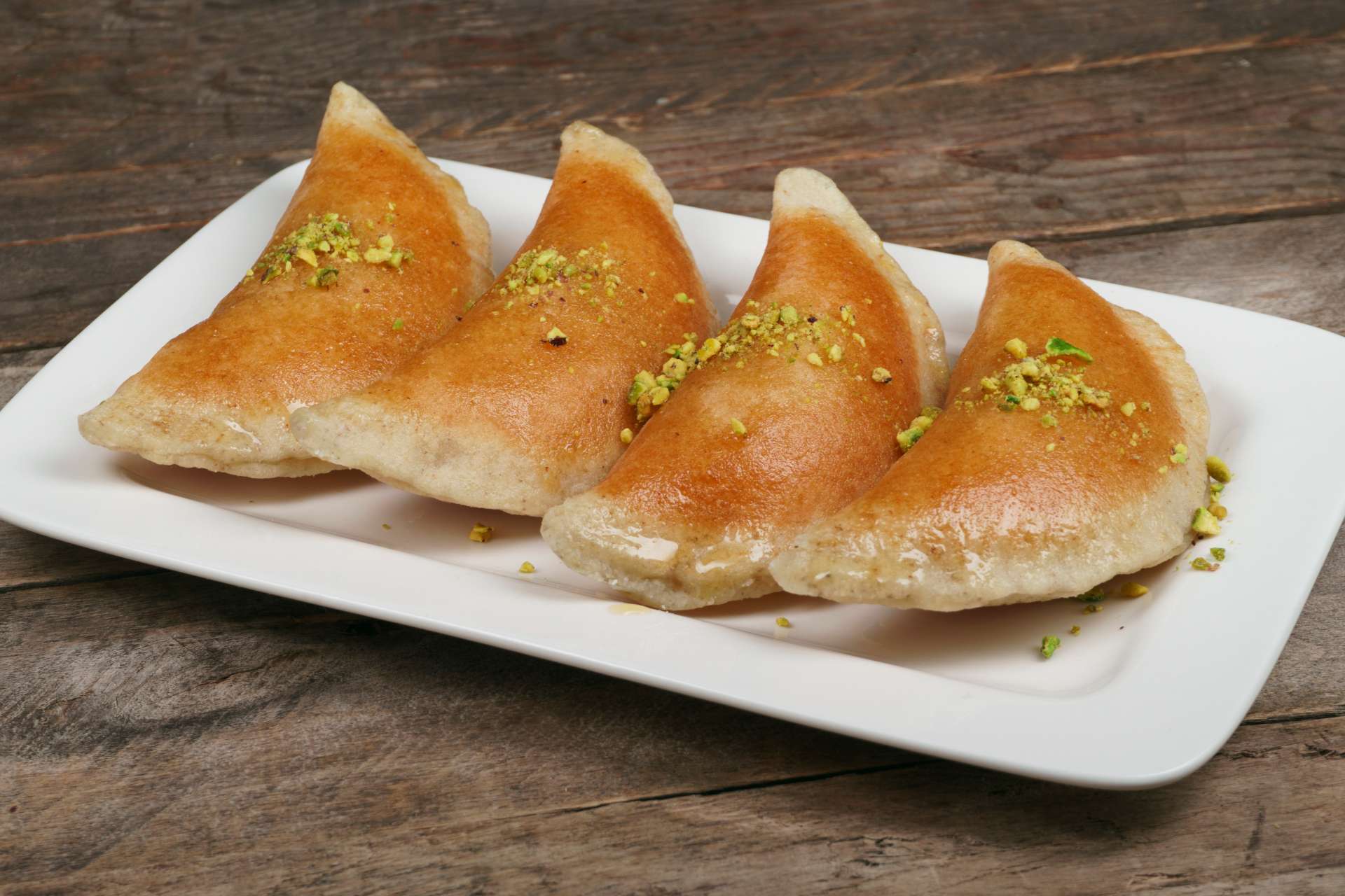 ナッツやレーズン、ココナッツ、シナモン、クリームなどの具材を詰めた半月形の生地を油で揚げ、甘いシロップをかけたり、刻んだピスタチオを振りかけたりして供されます。その起源には諸説あり、アッバース朝時代ともファーティマ朝時代ともいわれています。