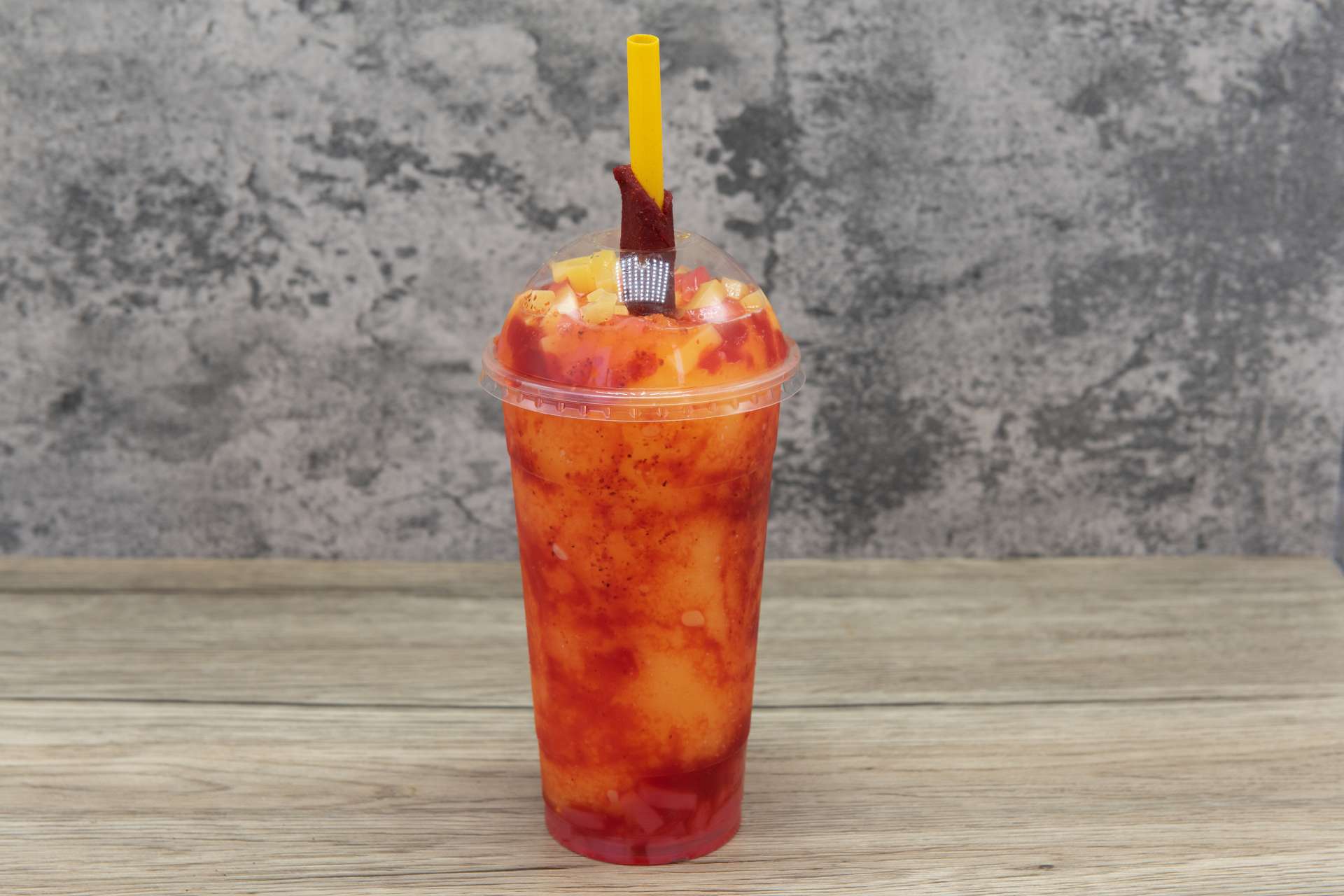 メキシコ風かき氷。マンゴーベースのかき氷に「チャモイ (Chamoy) 」と呼ばれるメキシコ特有の調味料やチリパウダー、タマリンドスティック (タマリンドペーストや砂糖、地理パウダーなどをストローに練りつけたもの) などが盛り付けられています。露店で供されているのが一般的で、特に夏の季節に多く親しまれています。
