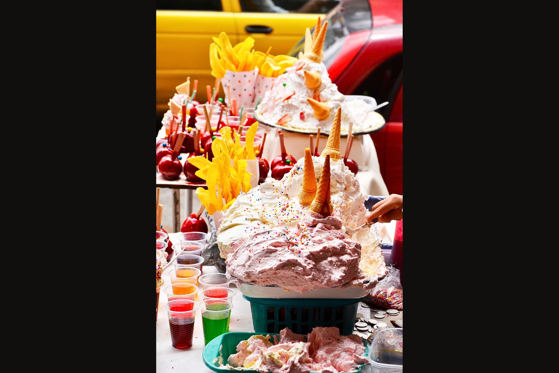 スペイン語で「泡」を意味するエクアドルのメレンゲ菓子。卵白や砂糖、フルーツピューレなどから作られるもので、アイスクリームコーンに盛り付けて供されます。