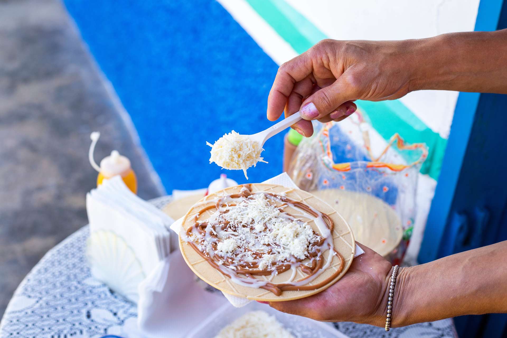 コロンビアの露店で多く目にするお菓子。「アレキペ(Arequipe)」と呼ばれるキャラメルソースやチーズ、コンデンスミルク、フルーツジャムなどのトッピングを組み合わせ、薄く丸いウエハースに挟んで供されます。コロンビアのみならず、ベネズエラ、エルサルバドル、メキシコなどの国々でも親しまれています。