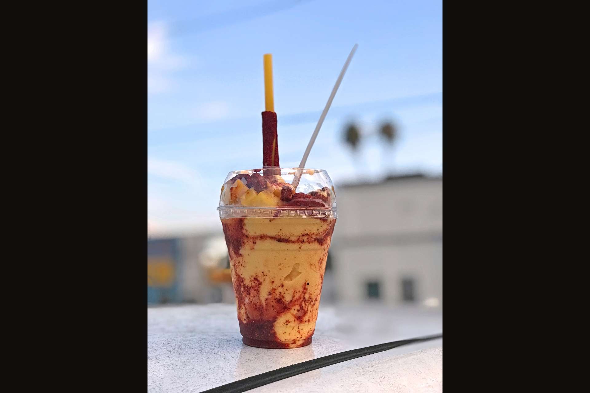 メキシコ風かき氷。マンゴーベースのかき氷に「チャモイ (Chamoy) 」と呼ばれるメキシコ特有の調味料やチリパウダー、タマリンドスティック (タマリンドペーストや砂糖、地理パウダーなどをストローに練りつけたもの) などが盛り付けられています。露店で供されているのが一般的で、特に夏の季節に多く親しまれています。