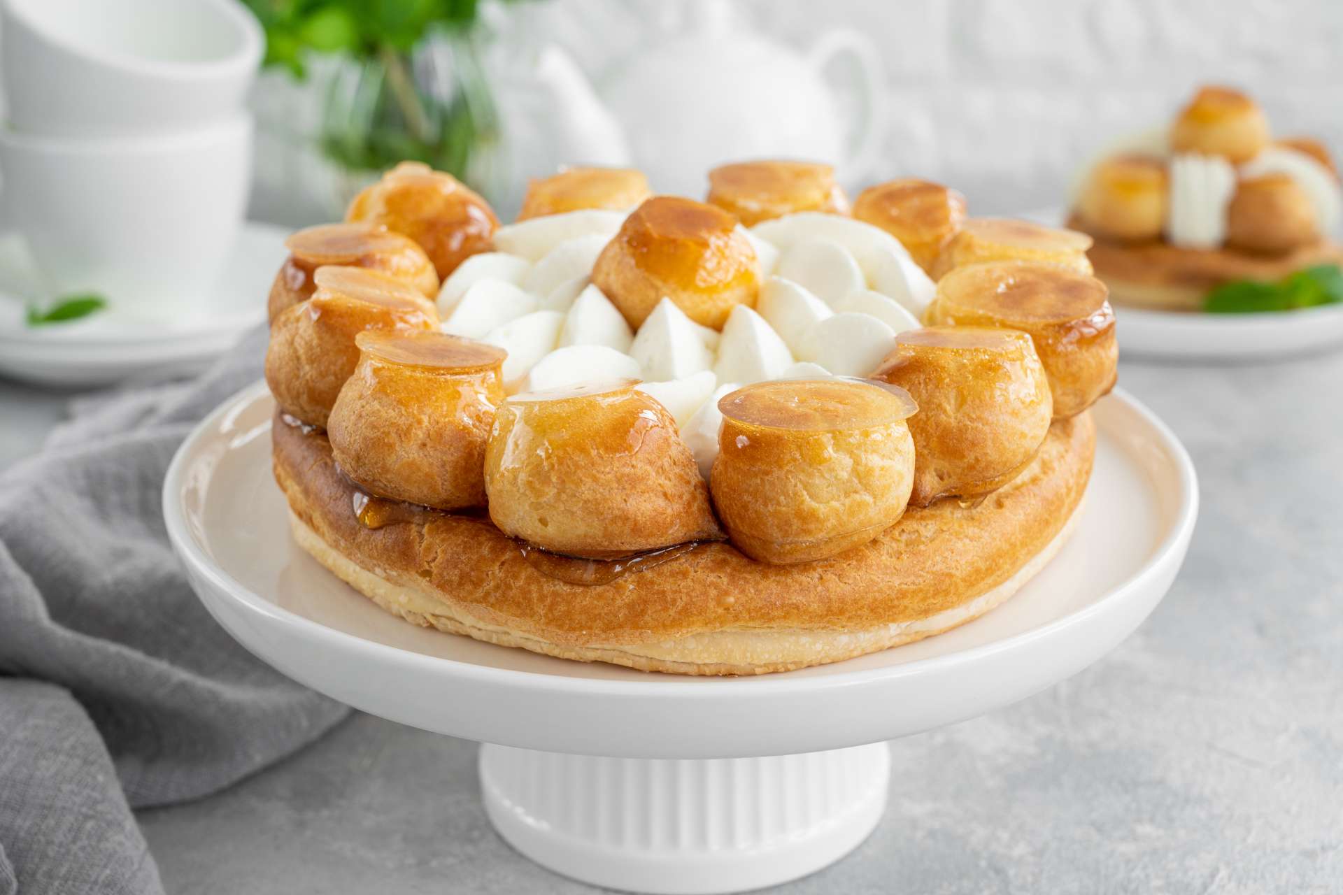 特別な機会に供されるフランス・パリ発祥のシュー菓子。土台となる生地の上にカラメルを塗った小さなシューを並べ、中央にクリームを絞って作られます。その歴史は19世紀頃、パリのサントノーレ通りにあった名店「シブースト (Chiboust) 」で生み出されました。「サントノーレ」とは6世紀のフランス・アミアンの司教、聖オノレ (Saint-Honoré) のことで、パン職人や菓子職人の守護聖人でもあります。