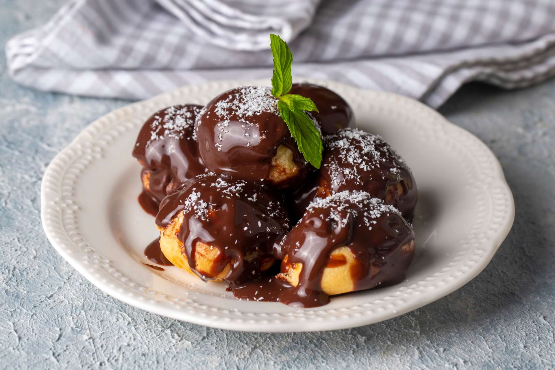 ホイップクリームやカスタードクリーム、バニラアイスクリームなどが入ったシュー生地に、上から温かいチョコレートソースをかけたデザート。「プロフィトロール」という言葉は16世紀頃から存在していたと考えられており、17世紀頃までは生地の中に肉や野菜を詰め、スープ (ポタージュ) に浮かべた料理として食されていました。
