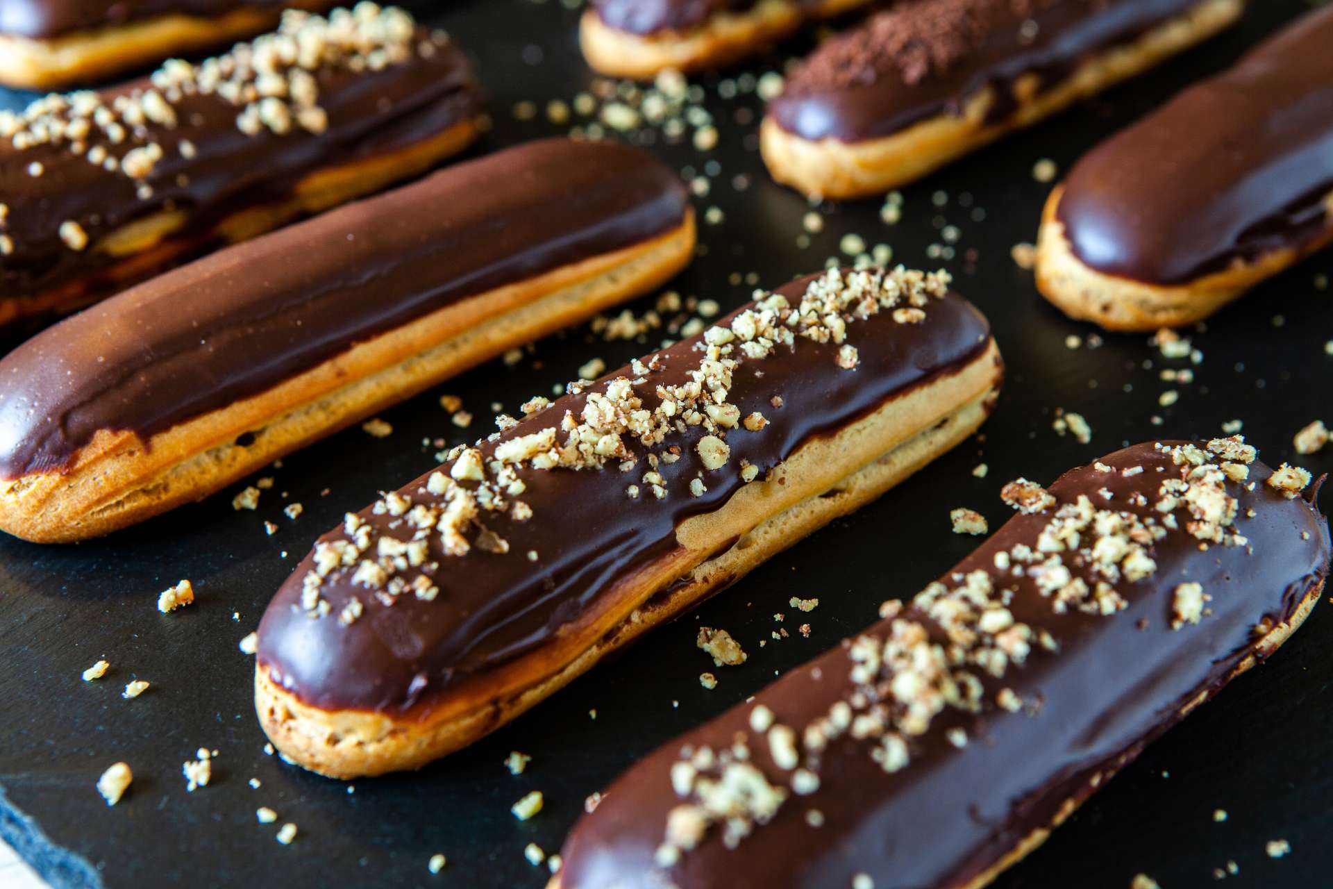 細長いシュー生地にホイップクリームやカスタードクリームなどを詰めたお菓子。生地の表面はチョコレートやフォンダン (糖衣) などでコーティングされています。1850年頃、偉大な菓子職人アントナン・カレーム (Antonin Carême) が「パン・ア・ラ・デュシェス (Pain à la Duchesse) 」と呼ばれるお菓子を改良して生み出したといわれています。