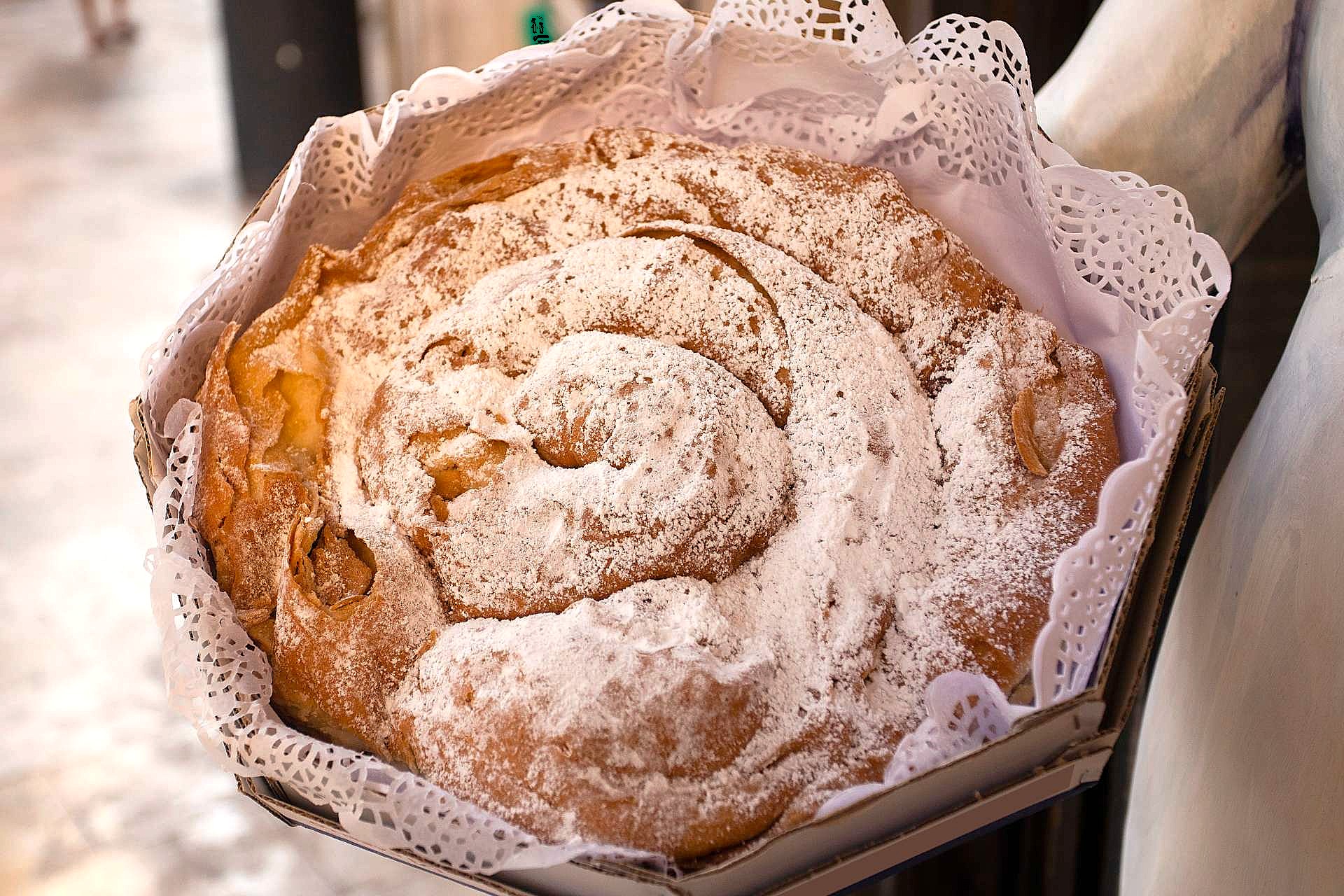 スペイン・マヨルカ島発祥の渦巻き状の菓子パン。小麦粉や砂糖、卵、イースト、水、ラードなどから作られ、生地の表面には粉砂糖が振りかけられています。その名称は、「豚のラード」を意味する“saïm”に由来します。生地の中にクリームやチョコレート、ジャムのフィリングが入ったものなど様々な種類があります。