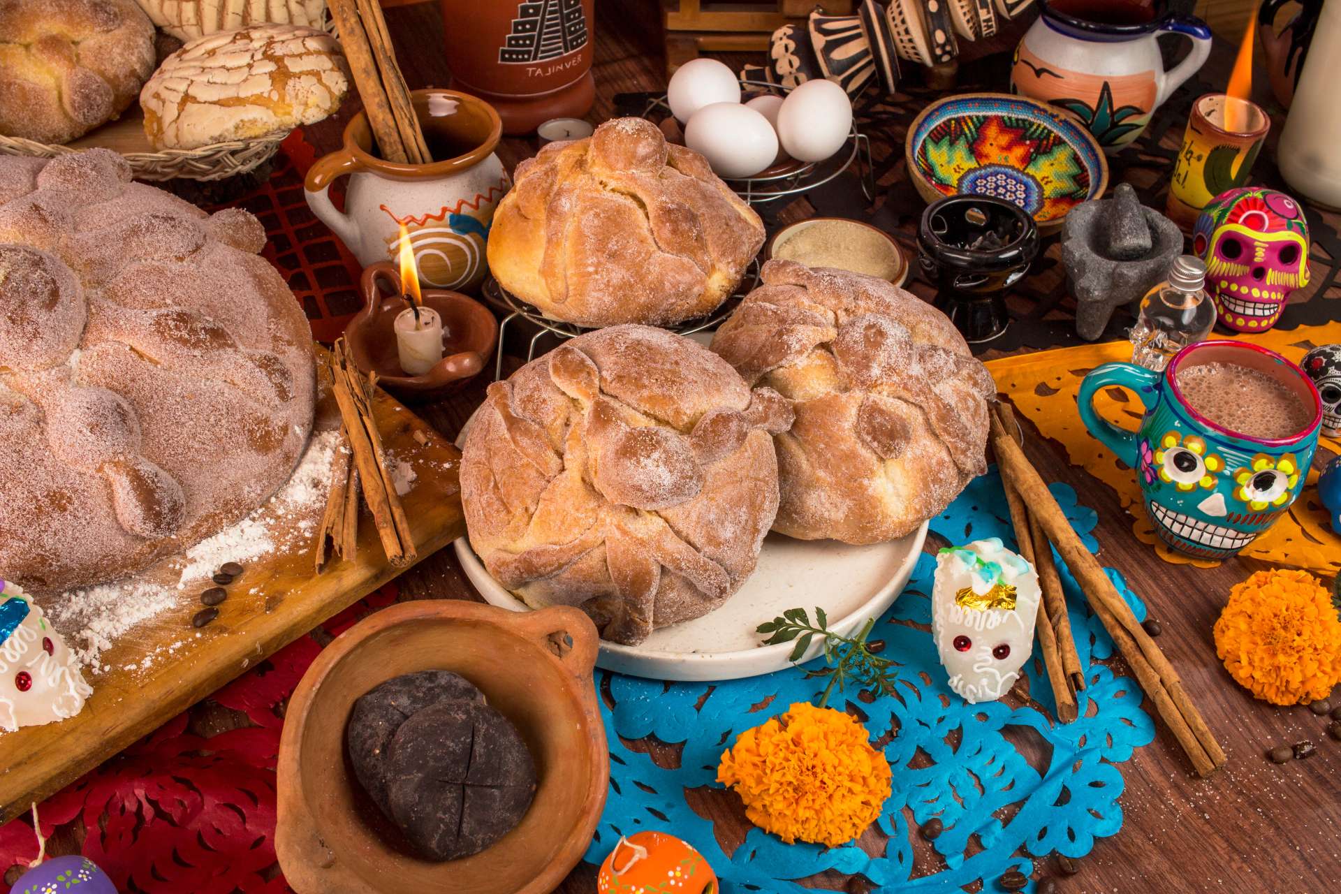 メキシコでパンが作られるようになったのはスペイン統治時代。スペインから伝わったパン文化と土着の儀式が融合して、死者の日には祭壇にパン デ ムエルトが供えられるようになったそうです。
