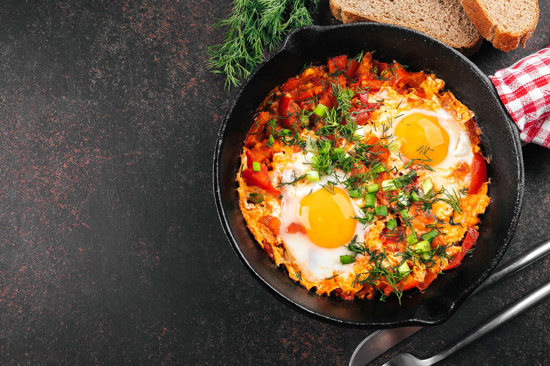 細かく刻んだにんにくや玉ねぎ、パプリカなどの野菜をトマトペーストと一緒に煮込み、その上から卵を割り入れた料理。チュニジアが発祥といわれており、その名称は北アフリカのベルベル人の言葉で「混合物」を意味します。イスラエルの他にも、北アフリカや中東の国々で広く親しまれています。
